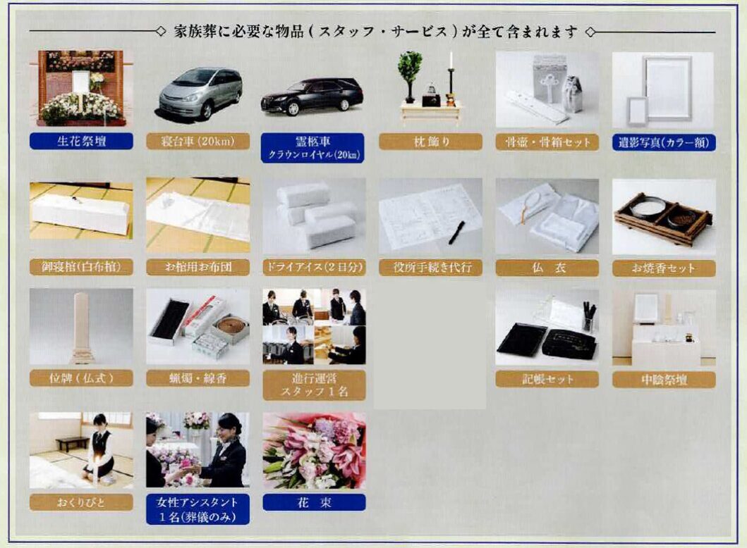 生花祭壇、寝台車、霊柩車(クラウンロイヤル)、枕飾り、骨壺・骨箱セット、遺影写真(カラー額)、御寝棺(白布棺)、お棺用お布団、ドライアイス(2日分)、役所手続き代行、仏衣、お焼香セット、位牌(仏式)、蝋燭・線香、進行運営スタッフ1名、記帳セット、中陰祭壇、おくりびと、女性アシスタント1名(葬儀のみ)、花束